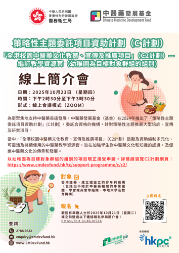 当中,「全港校园中医药文化教育、宣传及推广项目」(C2计划)鼓励及资助编制多元化、可灵活及持续使用的中医药教学资源套,旨在加强学生对中医药文化和知识的认识,及促进中医药文化的传承和发展。以幼稚园为目标对象群组的组别的项目现正接受申请。详情请浏览C2计划网页:https://www.cmdevfund.hk/sc/support-programme/c/c2/