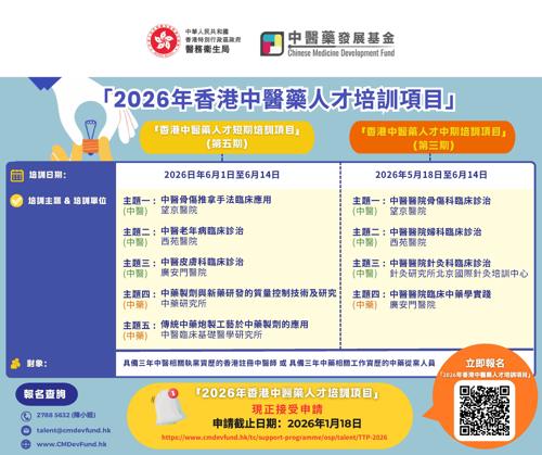 「2026年香港中醫藥人才培訓項目」包括第五期短期培訓項目(設3個中醫主題及2個中藥主題)及第三期中期培訓項目(設3個中醫主題及1個中藥主題),歡迎具備3年或以上經驗的香港註冊中醫師及中藥從業人員報名參加,獲取錄學員將獲中醫藥發展基金資助培訓及住宿費用。有關詳情已上載至基金網站,截止報名日期為2026年1月18日。